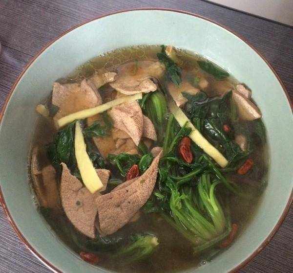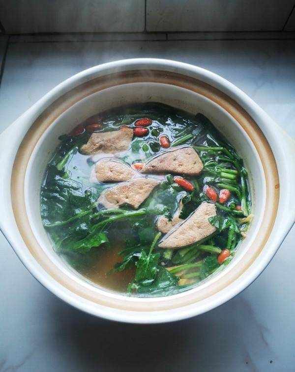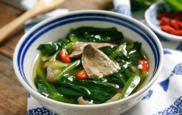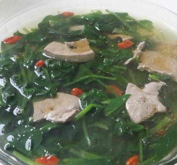 Tips:猪肝本身有很多腥味。无论是炒菜还是煮汤,都需要将猪肝清洗干净,然后将猪肉切成薄片,用清水冲洗干净,再用啤酒浸泡片刻,即可达到。腥味,还必须用盐和淀粉腌制,加入料酒,以达到去腥的目的。菠菜一定要洗干净,猪肉片也要洗干净腌好入味。锅底记得放姜丝和水,先煮猪肝,再放猪肉片,最后放菠菜段,最后放枸杞调味。猪肝颜色变了,加了香料,这道鲜汤出锅了。