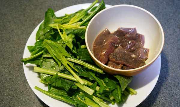 选择部分食材:准备新鲜菠菜300克左右(建议选择叶鲜红根的菠菜)、猪肝200克(一定要选择鲜嫩无异味的猪肝)、猪肉片150克左右(最好选择里脊肉)、枸杞一小把、水少许、淀粉少许、食用油少许、好喝的料酒、啤酒少许等。