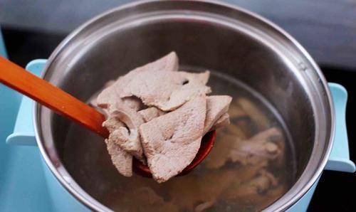 第六步:大火转小火,依次放入猪肝片(也可以先焯水),再放入猪肉片,等猪肝和猪肉片熟透。