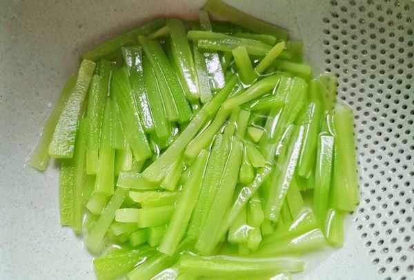 第二步:锅中倒入更多的水,撒上盐,将切好的生菜放入锅中20秒,迅速捞出,用冷水浸泡片刻,倒掉水分备用。