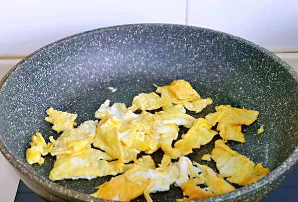 第五步:锅底稍微烧热,加入更多的油,抹上调好的蛋液,让蛋液完全炒熟,待两面成型后,用锅铲将鸡蛋煎成小块,然后将它们放入碗中备用。