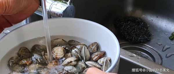 第一步:选择两种主料,将蛤蜊放入碗中,加两倍的水,撒些盐搅拌,让蛤蜊在熟悉的环境中自然呼吸,帮助吐出沉淀物。