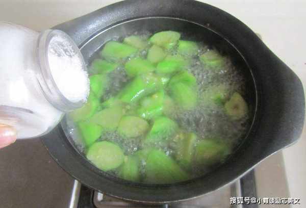 第七步:然后转小火继续煮。将丝瓜全部煮软,撒少许盐调味,加入鸡精和胡椒粉用勺子搅拌均匀。
