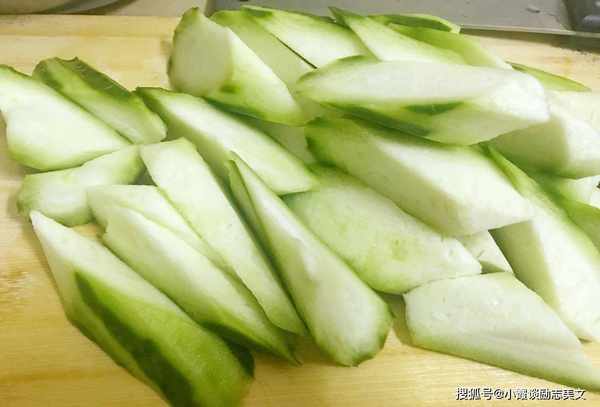 第二步:用工具将丝瓜去皮,切掉丝瓜的茎和尾,丝瓜洗净切块。一定要用冷水浸泡,以免丝瓜的营养流失。