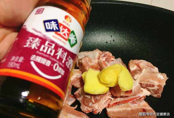 第五步:炖锅加入足够的水,将排骨放入锅中,加入一些姜片和百叶窗,再加些料酒去除鱼腥味,盖上锅盖用大火煮,约5分钟后,在上面倒一层漂浮泡沫,检查湿度并冲洗干净。