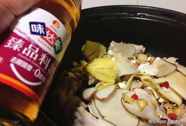 第七步:加入料酒,将莲子和百合放入锅中,放入少许海椰子和玉竹,让排骨汤静置80分钟,转小火慢炖。