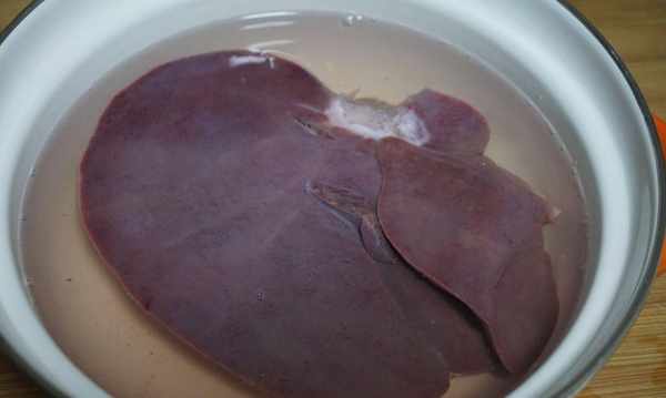 2:把买回来的猪肝放在碗里,加少许水浸泡半小时,把表面的粘液和血水洗干净,换刀把猪肝切成薄片,反复冲洗控制水分。