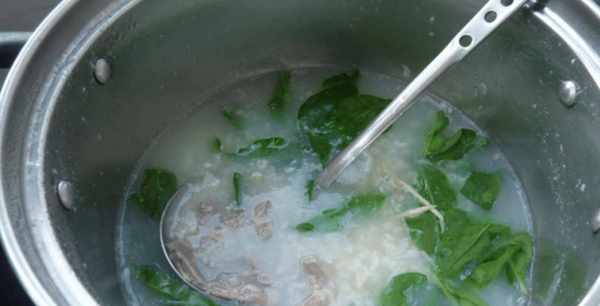 6:稀饭煮半小时,加入炒好的猪肝片,加入枸杞叶一起煮,用勺子拌匀成稀饭。