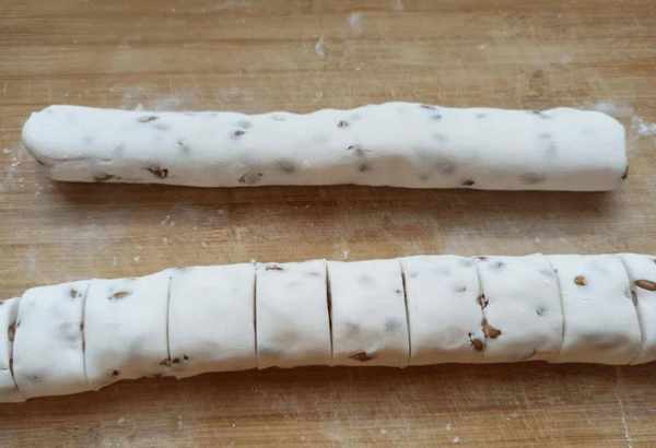 制作第五步:将红豆糯米面团放在砧板上,揉成长条状,然后切成小块。