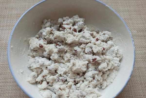 第四步准备:将红巴布和糯米不断揉搓。大约需要3分钟。根据面团的干湿程度加水,等红豆糯米面团软化。