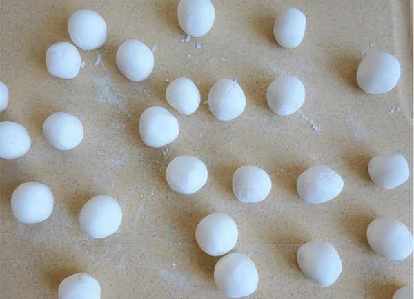 第三步:将面团揉成长条,挤成小份,全部揉成小汤圆。小汤圆不能太大,煮熟的汤圆体积要大一倍。