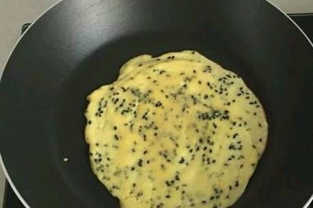 4、在锅还凉的时候,舀一勺面糊,摊薄薄的一层即可,小火慢煎至边缘焦黄,翻面再将另一面煎好。取出鸡蛋饼放在案板上,用筷子快速卷起来,放凉定型即可。平底锅用凉水冲一下擦干,再煎下一个。