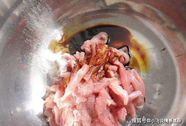 第三:娃娃片洗两次,把娃娃切成几薄片,再切成薄片,姜切薄片,娃娃用盐腌好,加入姜水和香料,加料酒去腥,最后涂上生粉,以保持肉丝的嫩度。