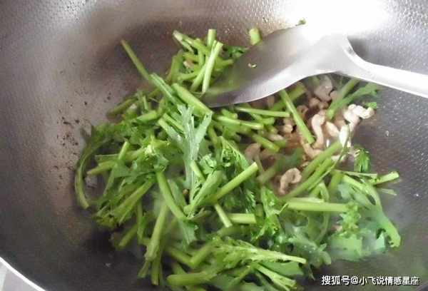 第六:加入半茶匙蚝油,两下快炒至均匀,撒上盐和鸡精,翻炒均匀,此菜香味独特,荤素营养,菊花炒肉娃娃菊花菜.