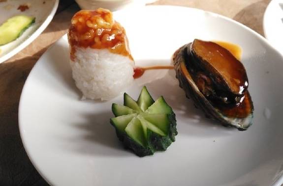 鲍汁捞饭。一人一例的鲍鱼,搭配的饭量一大口刚刚好,裹上鲍汁的米饭口感特鲜。