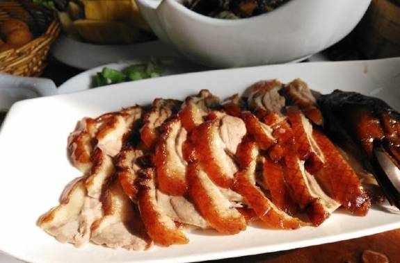 北京烤鸭。一张薄饼,两块烤鸭,些许大葱丝,黄瓜丝,再放一点面酱,包起来,大口一咬,幸福感爆棚。烤鸭下面的是一条超大的海鱼,酱香的做法,肉质细嫩,刺很少,相当好吃。