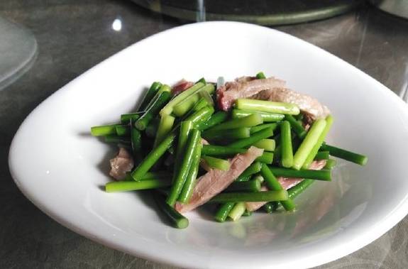 烧肉拌蒜台。烧肉就是许多北方都爱吃的猪头肉,两样菜这么一拌,挺香的。