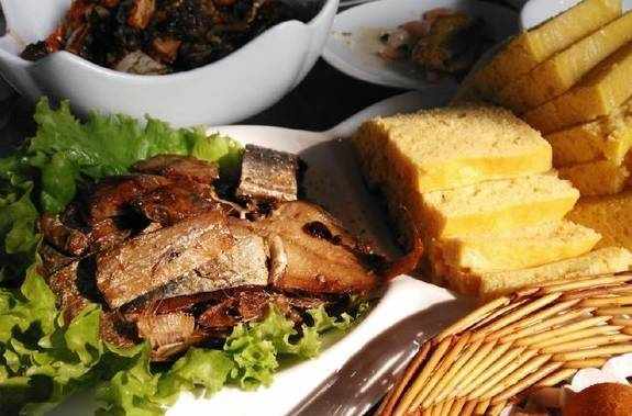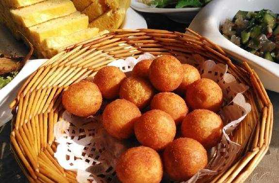 各种炸鱼。鲅鱼,带鱼,舌头鱼都是当地的特产,炸过之后特别香。金黄的玉米发糕,淡淡的甜味,好吃又易消化的粗粮。