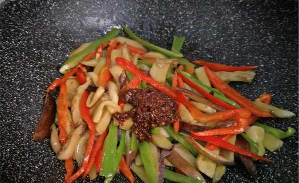 第五步:倒入辣酱,快炒酱汁,加入切好的青红椒,双灯笼椒炒至烂。