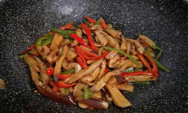 第四步:锅底留少许油,油烧热,放入辣椒片、蒜头少许,大火炒香,放入炸好的茄子,快速翻炒几下。