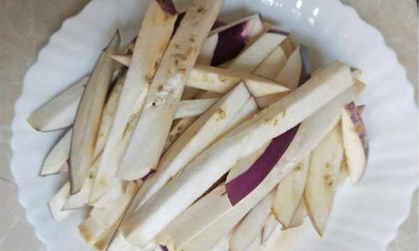 第一步:选择茄子和双椒,两个茄子去蒂,茄子洗净切长条(茄子不要太粗也不能太细),将茄子放入碗中,撒上盐腌一会同时,挤出黑水并检查水以备后用。
