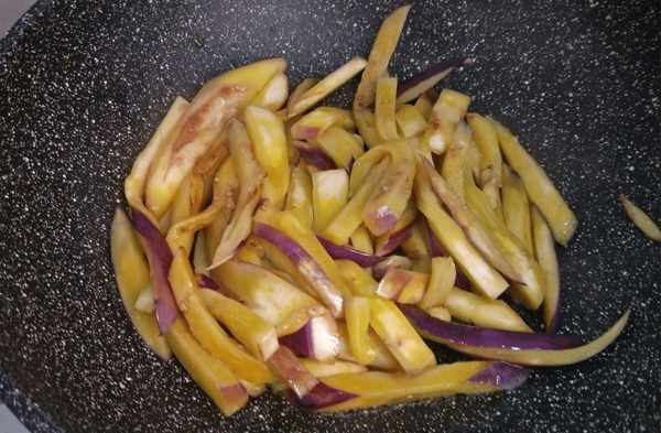 第三步:锅底倒入适量食用油,油温为70%热,将茄条放入锅中,稍微煎一下捞出茄条待用。