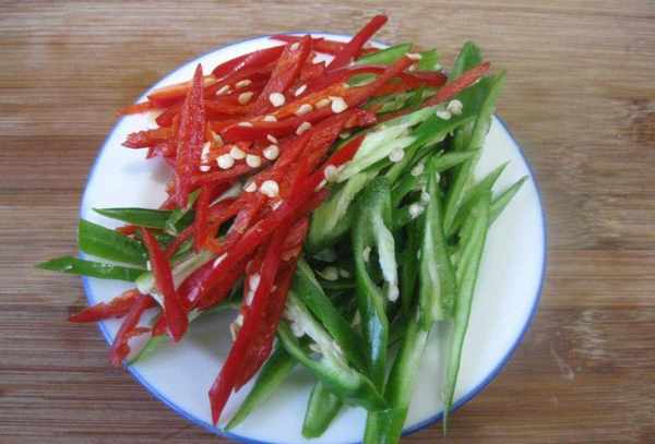 第二步:将红、青两个辣椒洗净,两个辣椒去蒂,对半切开,刮去籽,均切成薄片,大蒜拍碎,切成蒜泥。以后使用。