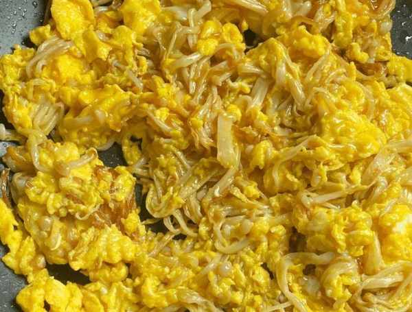 6:加入炒鸡蛋,鸡蛋透明的香味和金针菇混合在一起,快速翻炒几下,加入半勺生抽,半勺蚝油,加少许糖和盐,快速把配料炒熟。
