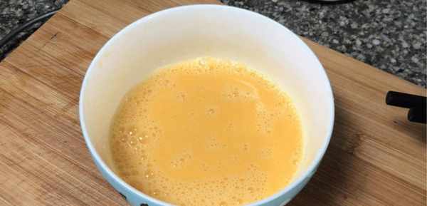 4:锅底稍微烧热,转中小火,将蛋液滑入锅中,煎至完全熟两面合拢,翻炒几下,即可装盘。在旁边。