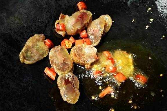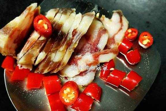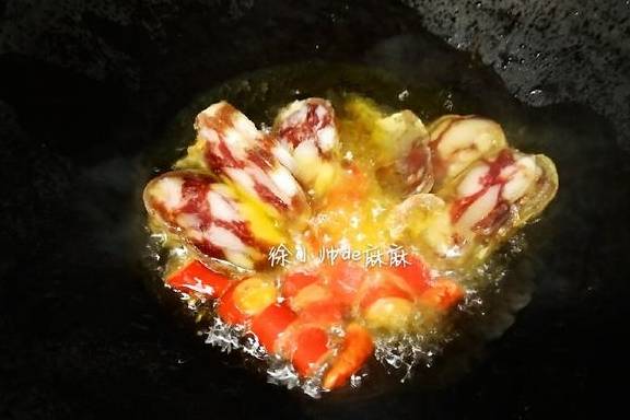 2、热锅热油,先将小米辣和腊肠放进去爆香。
