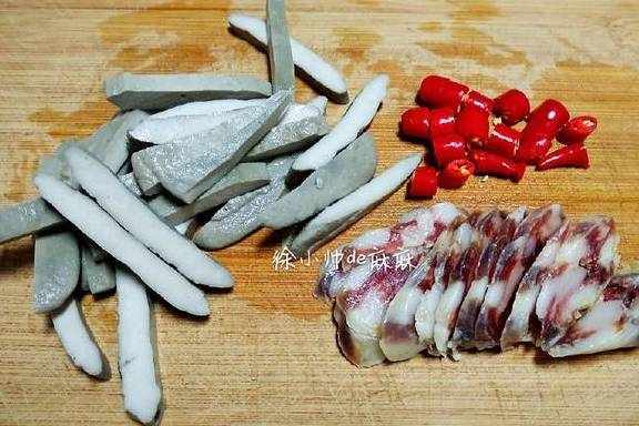 1、食材准备:芦蒿一把,摘掉叶子,留下杆子。将杆子折断成一小截一小截的,漂洗干净沥干水。腊肠一小截,切薄片。小米辣两个,洗净剁碎。臭干几块,洗净切粗丝。