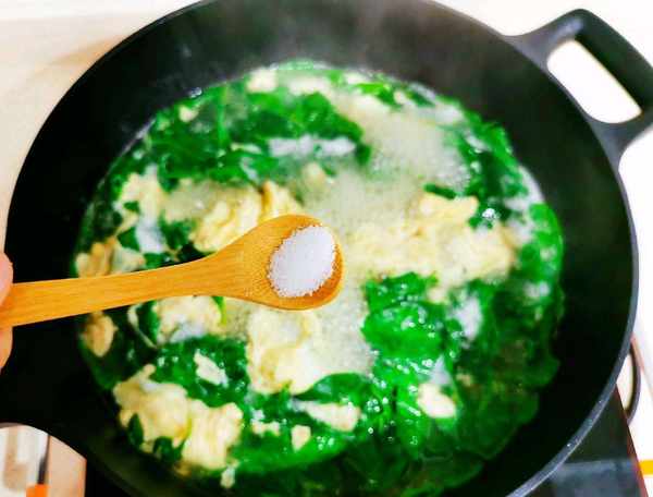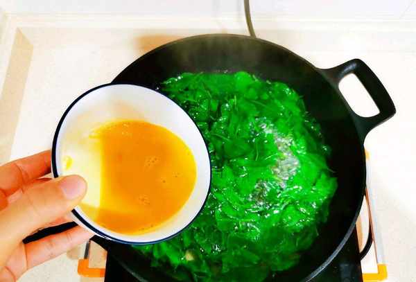 4:加上洗净的枸杞芽煮30秒,然后调到中火,将鸡蛋液淋在锅中,中途不要搅拌,这样避免鸡蛋液成蛋花,而不会凝固成形。
