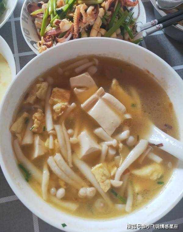推荐词:海鲜菇是一种非常新鲜柔软的蘑菇。蘑菇根很脏。别忘了把它们去掉,然后把海菇焯水几分钟,这样海菇的味道会更好。这道豆腐汤是先把豆腐用水泡一下,然后把豆腐焯一下,再用小火把蛋壳煎一下。这道豆腐汤最好选用猪油,加入蟹味菇炒熟,加水,再加入豆腐和蛋壳,加点调料,但不要加鸡精和味精,会影响汤的鲜味品尝。最后,在上面撒上切碎的葱,用文火炖几分钟。
