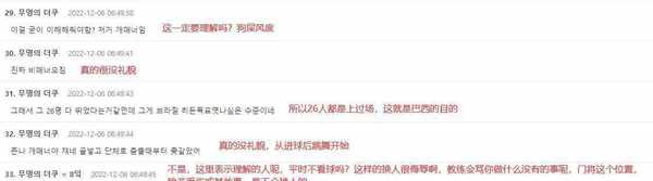 韩国球迷认为这一个“人情世故”的举动是对他们韩国队不礼貌,甚至还提及了当年被德国7-1血洗的时候,诺伊尔也打满了全场,而巴西却在这个时候选择换三号门将。种种带着负面情绪的评论,也直接体现出韩国球迷的整体素质!