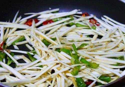 6:另起一锅,加入少许油,茭白翻炒,茭白炒软,加入青椒丝和红辣椒丝,倒入炒好的肉丝。