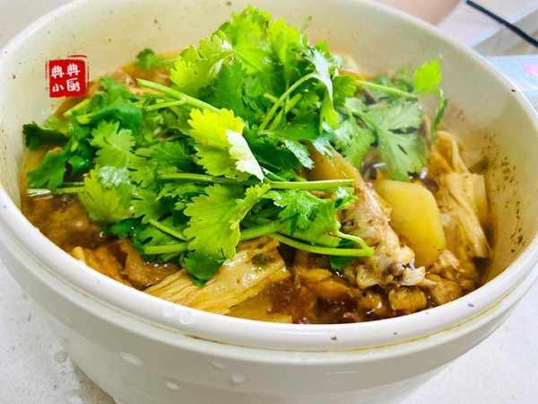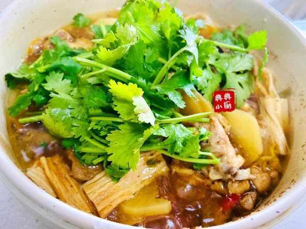 天气降温冷了,我就把鸡块放到电子锅里收汁,这样就可以保温久一点了。中间记得把土豆块和腐竹放进去,再加盐提味,撒个香菜就可以了。