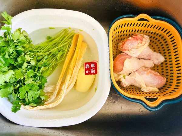 鸡腿拿出来解冻,腐竹也需要提前泡发开,还准备了土豆,还有一些香菜。