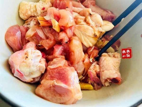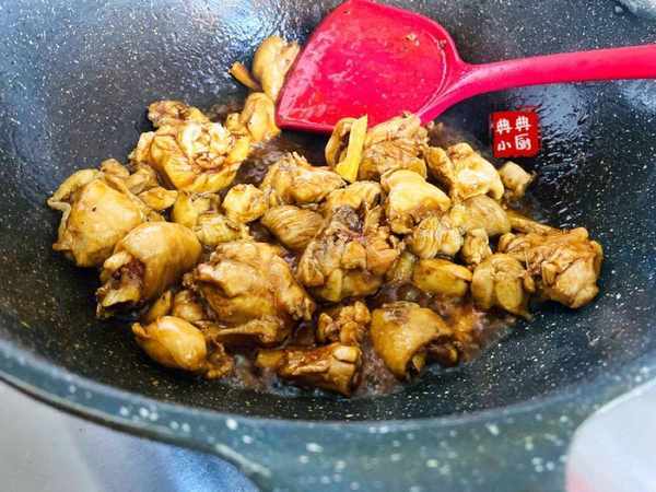 起油锅把鸡块倒进去翻炒至变色,加一点生抽炒至上色。