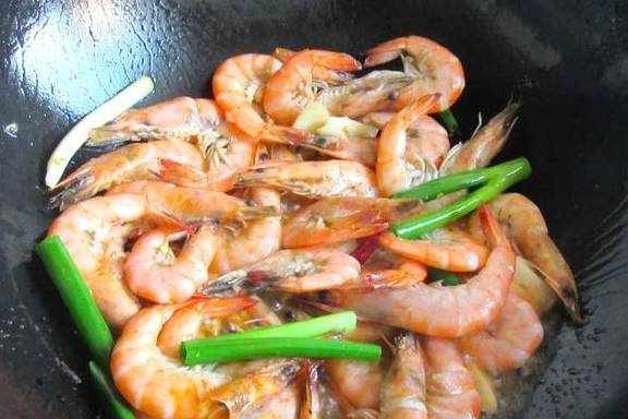 5、倒入虾、蒜片、葱段,辣椒,翻炒一分钟后盖上锅盖焖2分钟左右即可
