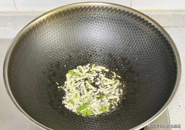 3:锅底放少许热油,放入猪油渣翻炒几下,放入葱姜蒜,快炒片刻,放入海带块翻炒半天.2分钟。