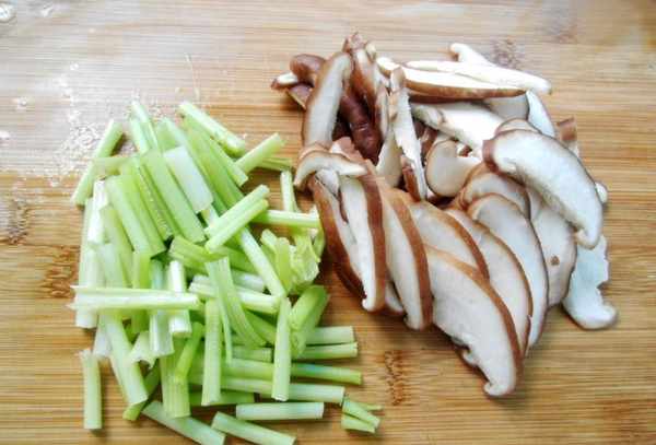 第四步:切几瓣大蒜,将大蒜切成小块,沥干干条,准备一些配菜,开始用芹菜和香菇煮这些炸条。