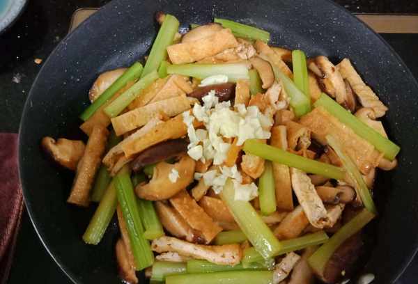 第七步:加入蒜末,加少许盐和糖,加少许鸡精和胡椒粉,快速翻炒,翻炒几下,装盘,由芹菜和香菇组成的这道美味永不油腻。准备好了,它们比猪肉好吃。
