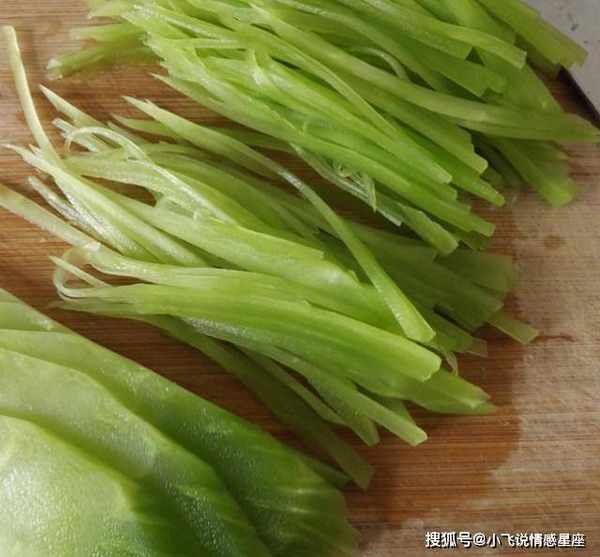 第一步:准备好用料,将生菜剥去一层皮,将生菜去根去茎,将生菜切块,然后用刀切成几缕。