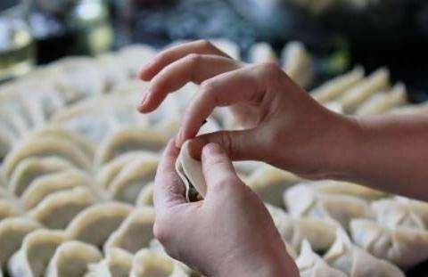 8:把饺子皮放在手上,然后把调好的饺子馅放在饺子皮上,然后用手揉成条状,然后把所有的饺子放进一个容器里,不要把饺子粘在一起。