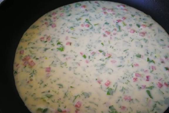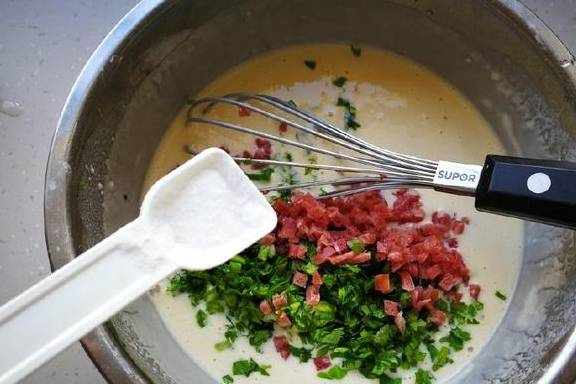 4、放入切碎的芹菜叶和火腿肠末,加入适量盐和少许胡椒粉,充分搅拌均匀。这里可以根据自己的喜欢加入其它蔬菜,比如蘑菇,菠菜,西葫芦,韭菜,莴笋叶等等都可以。