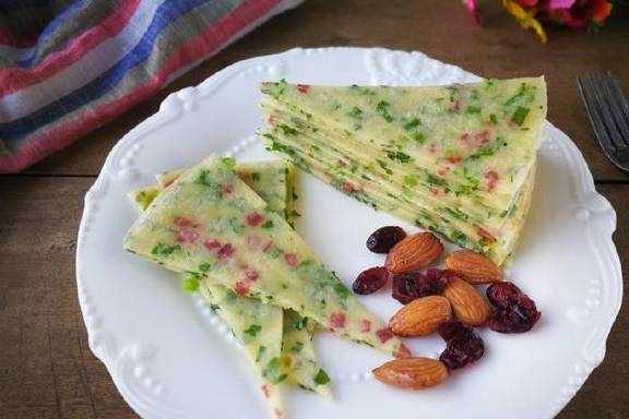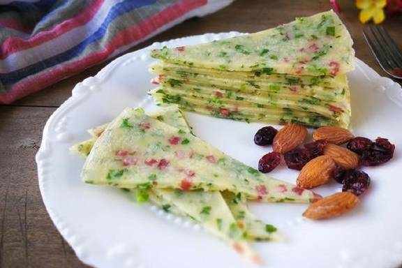 7、出锅后切块食用,早餐搭配牛奶或豆浆,再来一点坚果和果干,营养还算均衡。这一招对付挑食的小孩最有效,我家的小朋友不喜欢吃芹菜,加入了他爱吃的火腿肠,一个人就能干掉一整张饼。