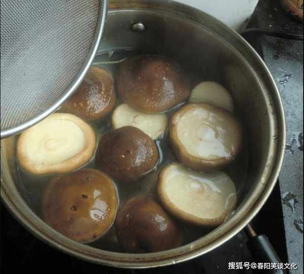 3:锅中倒入半锅水,烧开后加入盐和小苏打,锅中撒入一些香菇,将香菇用热水焯一下,用清水浸泡,沥干。水和香菇切成片。