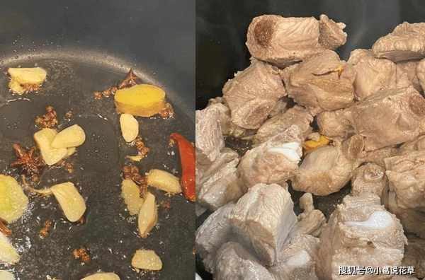 第五步:倒入料酒、少许生抽和老抽去腥,加入一勺蚝油提鲜,加入八角、桂皮和香油,倒入适量清水,盖上锅盖大火慢炖10分钟。