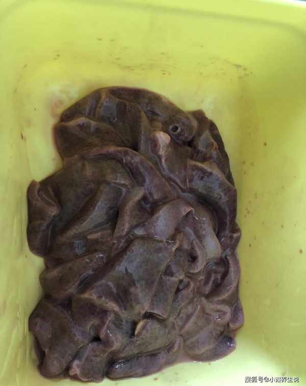 第二步:把猪肝片放在一个大容器里,多倒水,用手洗几遍,再用流水冲洗几遍。