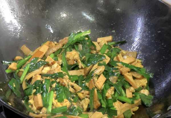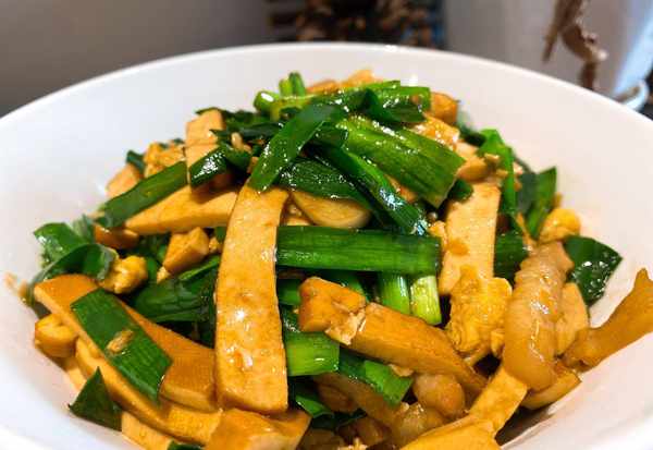 食材:韭菜、鸡蛋、五花肉、香干、葱蒜、酱油、蚝油、食用油。